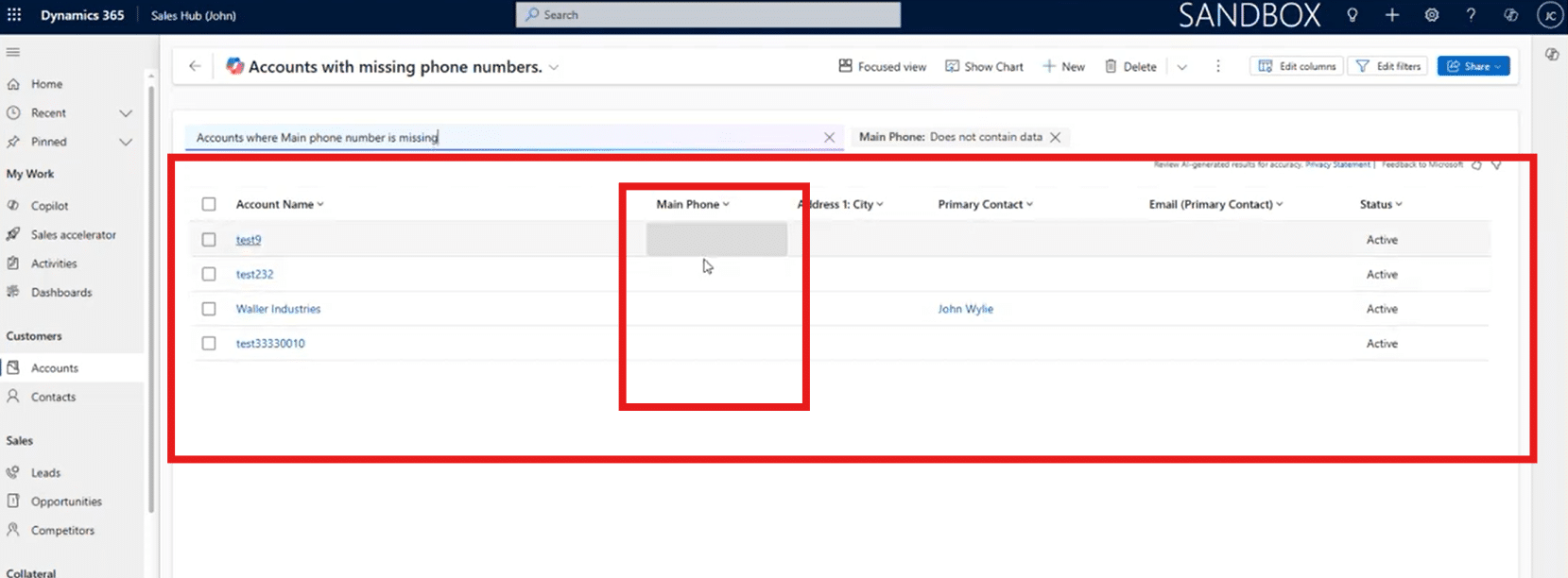 Copilot will correctly interpret the request and add a filter for “Main phone – does not contain data." Copilot was able to translate the intent and apply filters to find the information. This saves the user from having to go through additional steps like: