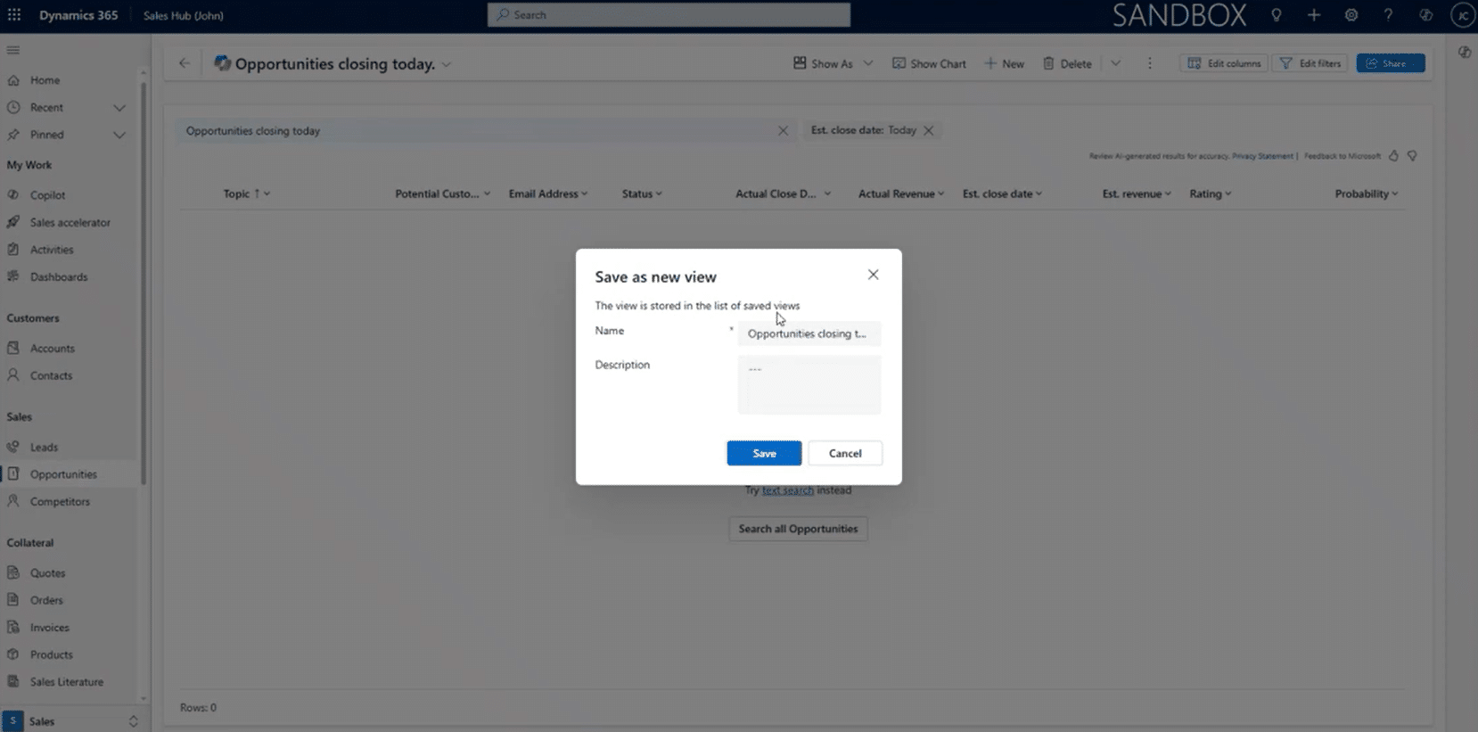 If a user wants to keep the results, they can save them as a new view—just like any custom view. You can edit, add, and remove columns, and make it your own. Dynamics even adds a Copilot icon next to the view name, so users know it was created via natural language search. This enables your team to leverage automation without requiring manual intervention.