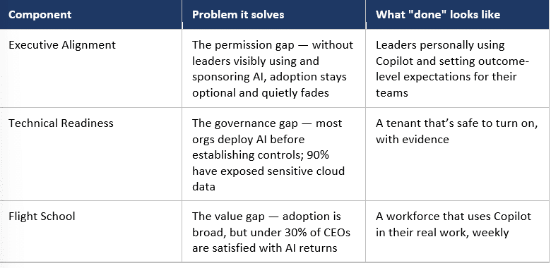 No single component produces durable value on its own. Executive Alignment without Technical Readiness creates excited leaders pointing at data their employees shouldn’t see. Technical Readiness without Flight School produces a safe tenant full of dormant licenses. Flight School without Executive Alignment delivers enthusiastic practitioners stranded by leaders who never quite followed through.