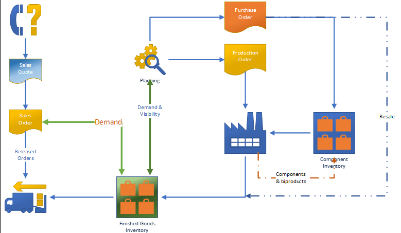 Simply stated: Sales orders create demand against your finished good inventory. Finished goods demand creates demand upon inventory, production and/or purchases based upon the item or component availability at a given point in time.