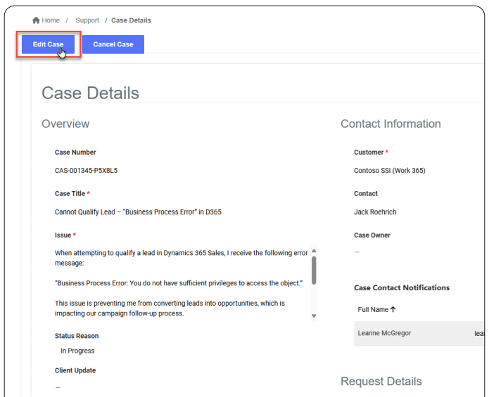• You can also select Add Contact Notifications to select other portal users from your organization to get updates on the case.