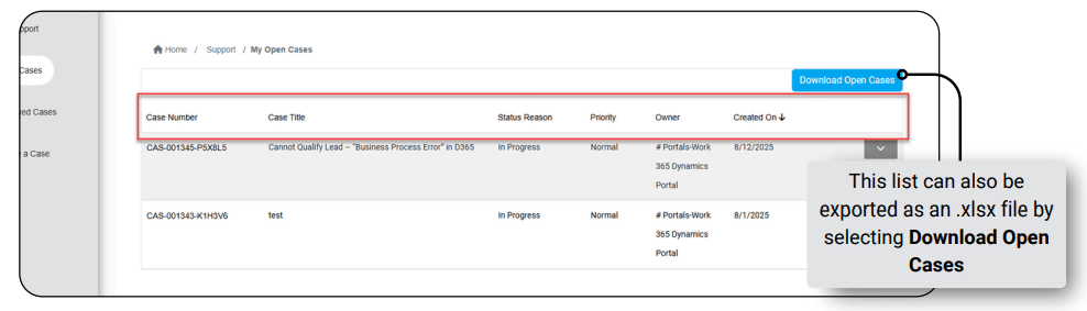 • You will see a list view with filters for Case Number, Title, Status, Priority, Owner, and Created On.