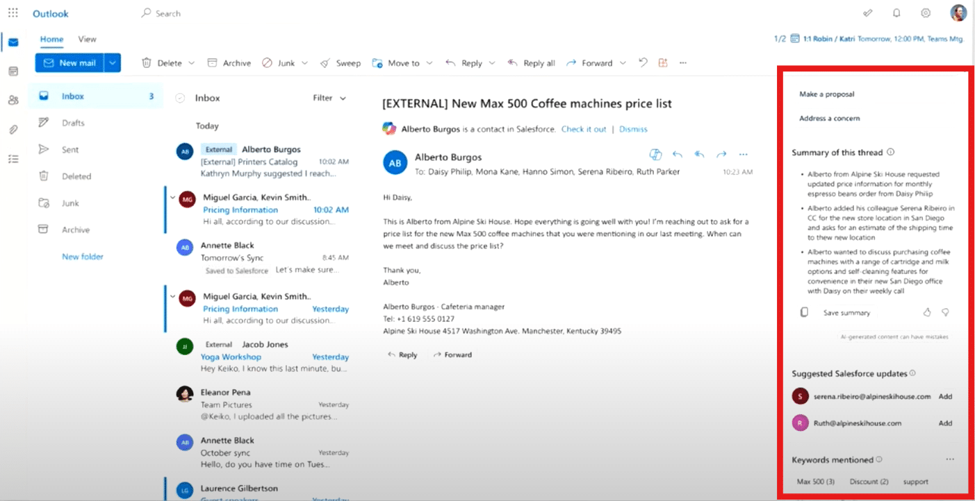 - Automated Contact & Opportunity Management: When Copilot detects a new contact in an email signature, it suggests adding them to CRM and provides opportunity summaries with next-step recommendations.