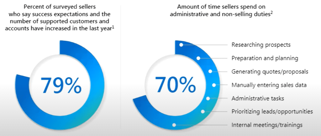 According to a Microsoft study, every time a sales rep switches between applications – such as switching from Outlook to a CRM system – productivity drops by 40-60 percent, and it can take up to 15 minutes to regain focus. In that same study, researchers found that 79 percent of respondents reported that success expectations have increased and that they spend 70 percent of their time on non-selling activities.