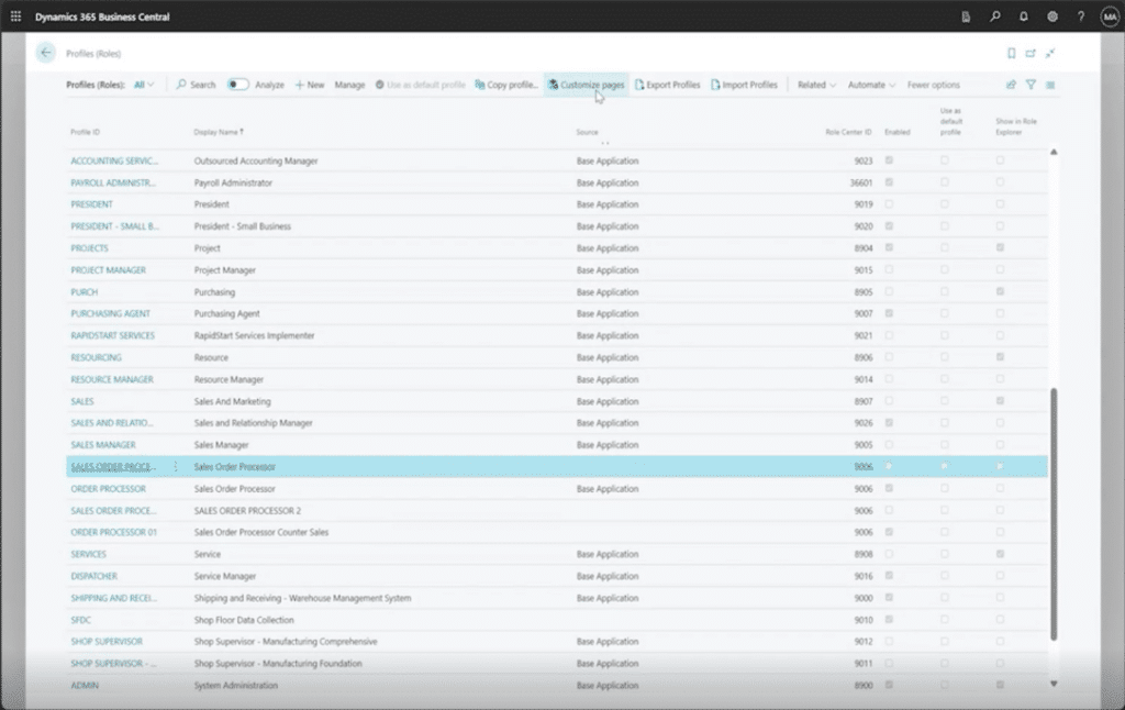 - Navigate to Customization Options: Select “Customize” under the Role Center you wish to modify.