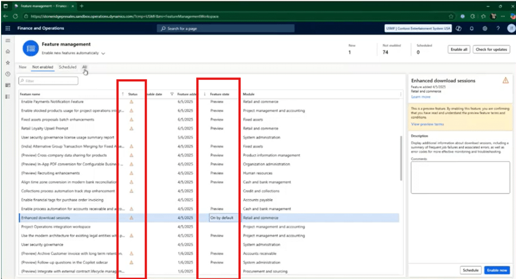 While we addressed these states above, let’s give you a visual view of feature states and how they function within the steps to enabling enhancements in Dynamics 365 F&SCM. In the list of features, you will see a column with your states: