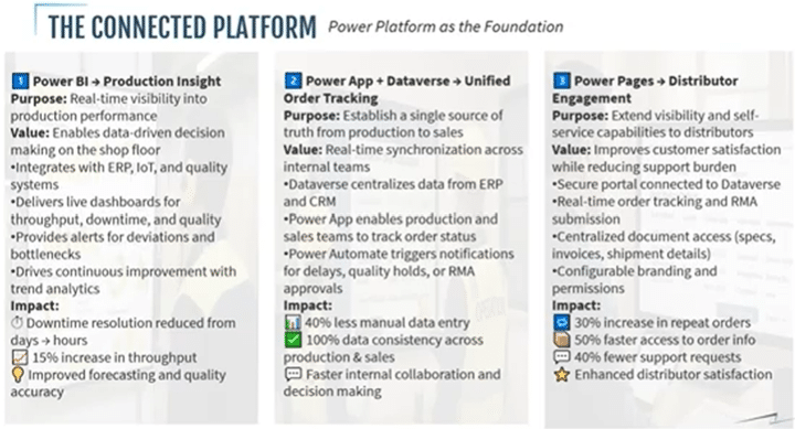 While Power BI delivers insight, Power Apps and Dataverse are the operational backbone that connects production to ERP solutions like Sales and Customer Service.