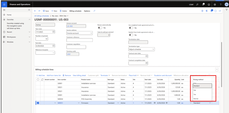The Pricing method is used for pricing at the line level. The Standard allows the use of trade agreements and sales agreements and Flat allows for manual entry of a price, but there also Tier and Flat tier. Flat and Standard are by far the most common options.