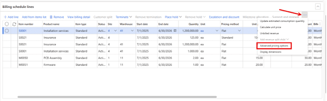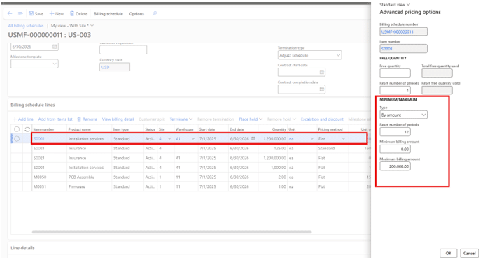 Once you select ‘Advanced pricing options,’ it opens this window below. You can add free quantities. Under the Minimum/Maximum section you can put in minimums or maximums by quantity or amount. In my example below, I have a $200,000 maximum which will reset in 12 months back to zero and start over for the top line on my billing contract.