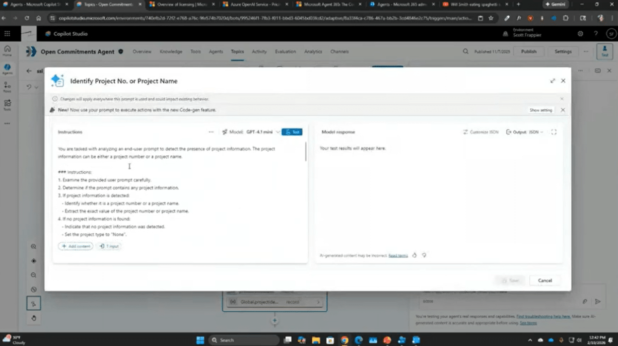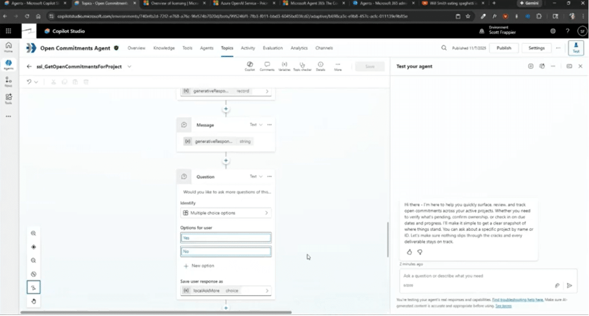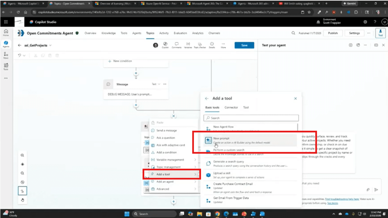 Copilot Studio serves as the builder and manager of your agents. It allows you to define what the agent is going to do, its instructions, how it’s going to tackle processes, and what tools it will use to address those tasks.