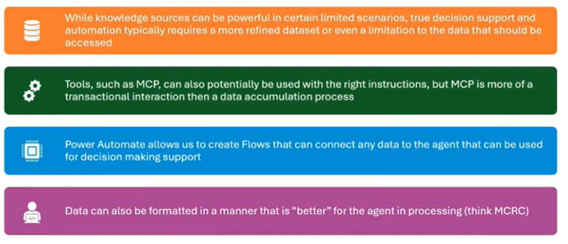 One of the most important strategic insights: Copilot Studio works best when orchestrating tools instead of doing everything and generating content by itself.