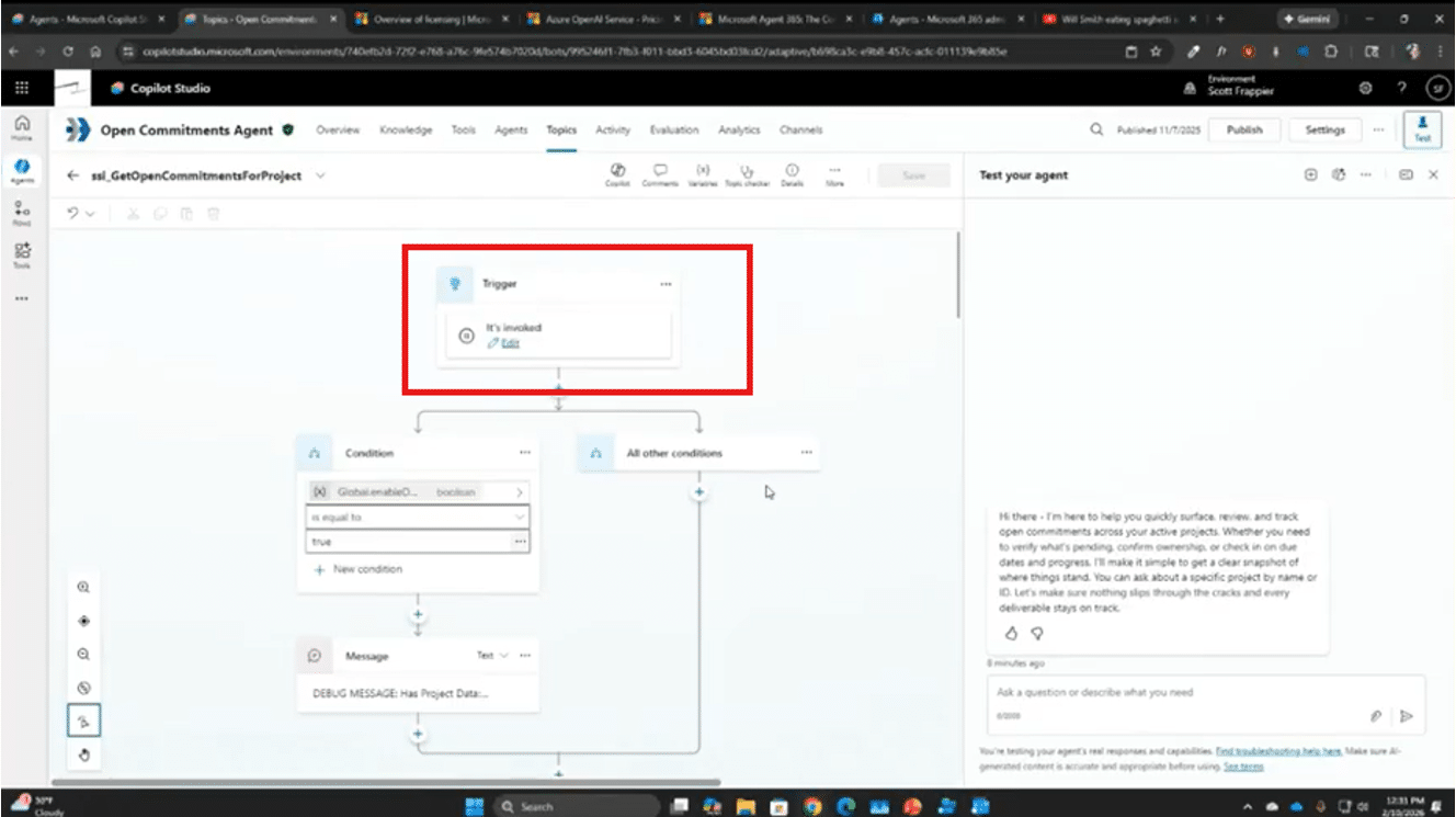 You can also set up different conditions for the agent workflow. For example, if you have a Power Automate agent flow that triggers when a company receives an open commitment for a project. You can set up a condition or requirement that forces the agent to access your system and retrieve all related data for the project, store it, and use it in other processes.