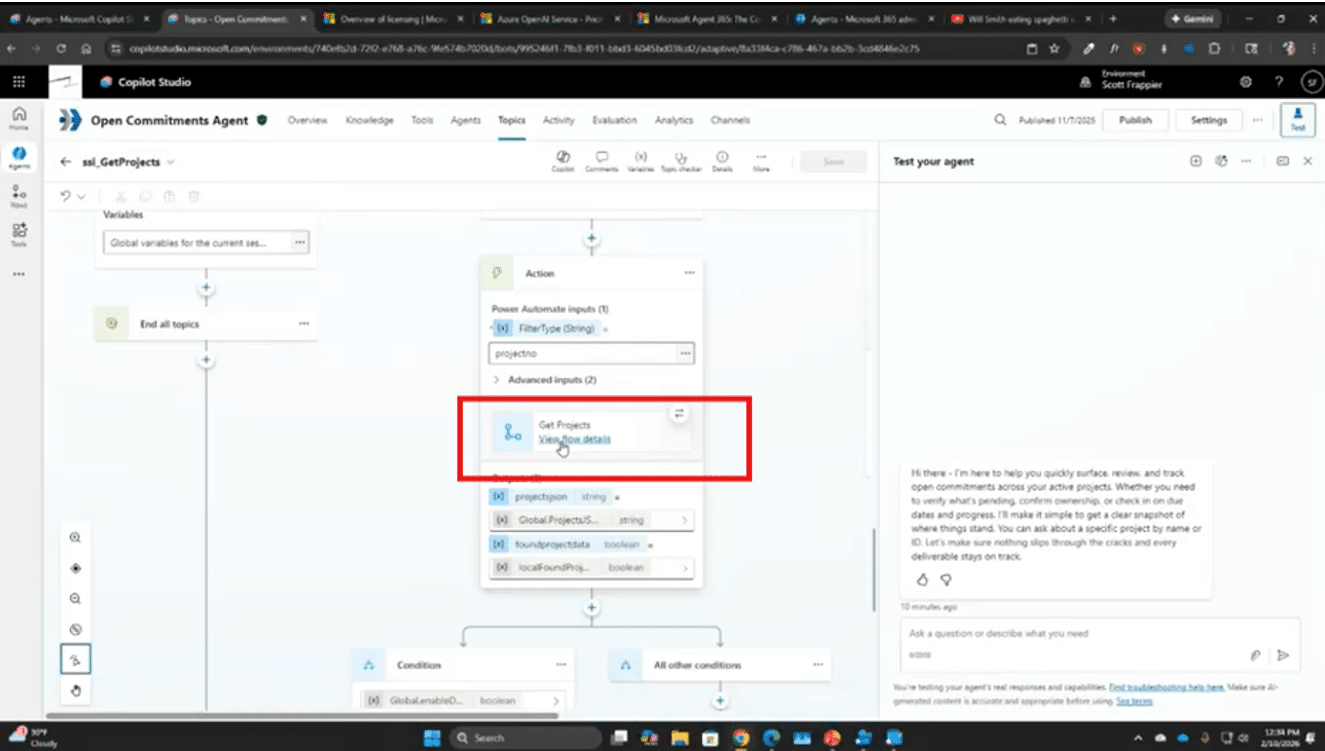 For the agent in this example, we added a flow called “Get projects”, which pulls in related information. If you want to change or edit anything within the flow (whether it’s an existing flow or a new one that needs to be structured), you can click on “View flow details” and make those edits directly through Power Automate within Copilot Studio.