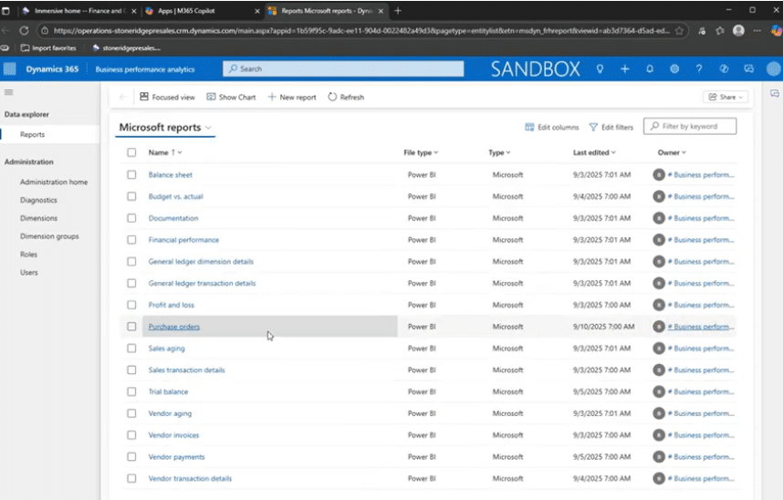 Once you install BPA, you can access 15 Microsoft reports that are pre-configured and programmed into the workspace. These reports cover common financial and operational use cases, including: