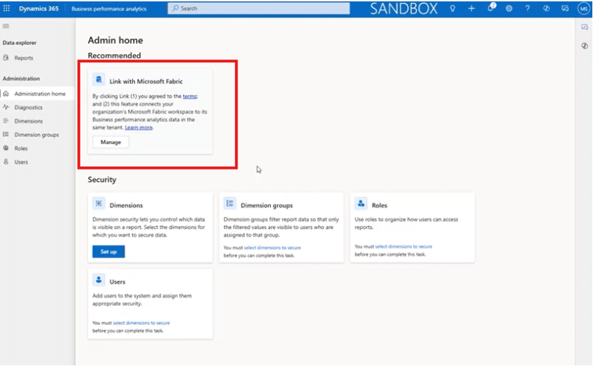 2. Click on the Manage button in the Link with Microsoft Fabric box How to link BPA to Microsoft Fabric
