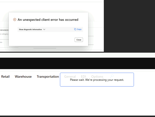 - Once you open a given form, especially the details of List w/ Details form, clicking back will result in a stuck "Please wait. We're processing your request" with no timeout windows appearing.