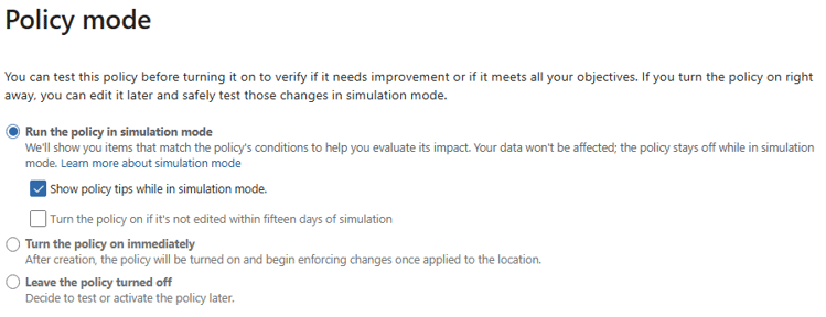 - Finally, your policy can be deployed in any of the following modes, but we suggest running in simulation mode with policy tips for any DLP to confirm accurate actions and expected outcomes.