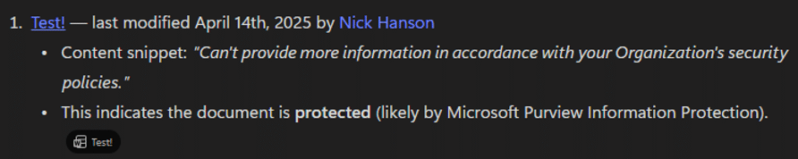 When a user prompts copilot regarding a data source with the label the DLP is created to block processing of, they will get a message similar to this: